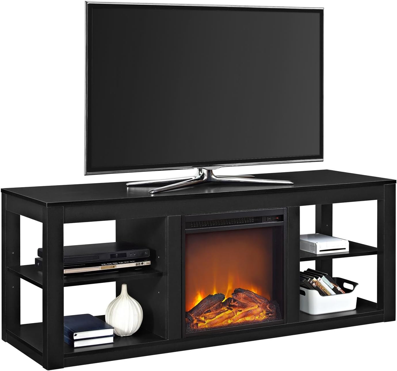 The ameriwood home vision is to improve the lives of our customers with home furnishings that function well and are affordable to everyone. Ameriwood home chicago electric fireplace tv console. Ameriwood furniture | wildwood fireplace tv stand for tvs up to 60. Northwest electric fireplace freestanding console with shelf space heater your fireplace tv stand should also be big enough to house your entertainment center. Realistic flame effect, with fireplace, with storage, with drawers, with shelves,with fireplace, lighting, 4 open shelves, 18'' fireplace insert, realistic flame effect, holds up to a 65 flat screen with a maximum weight of 120 lbs, electric fireplace, electric fireplace, lighting, media storage.